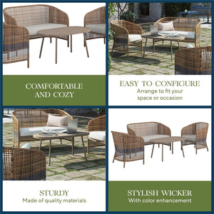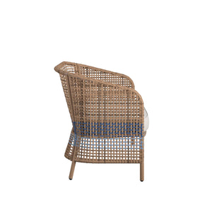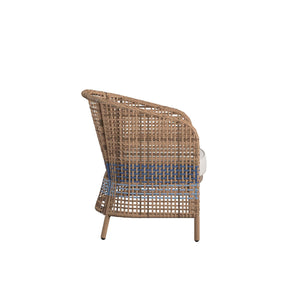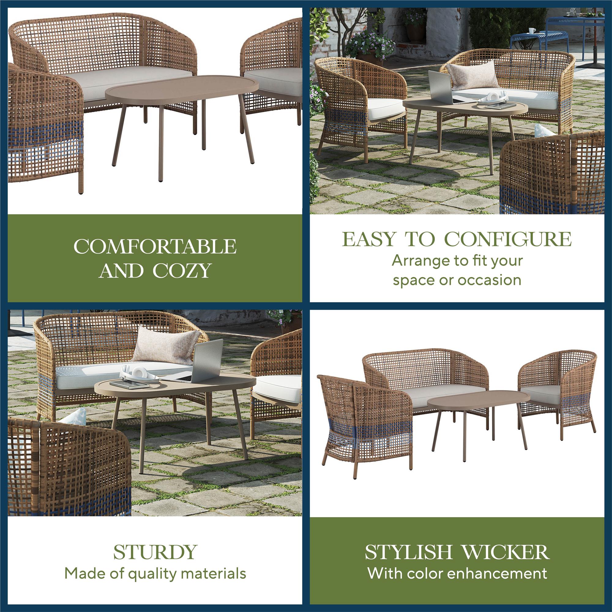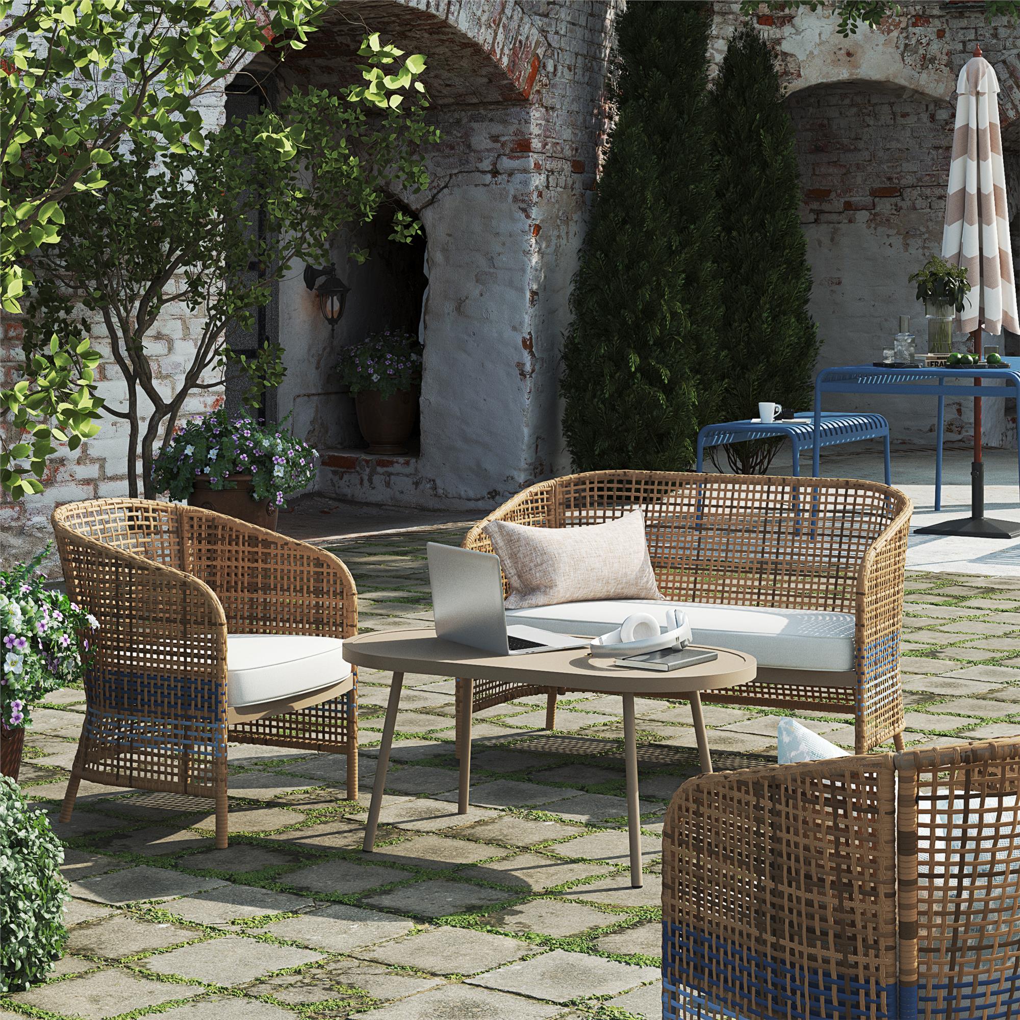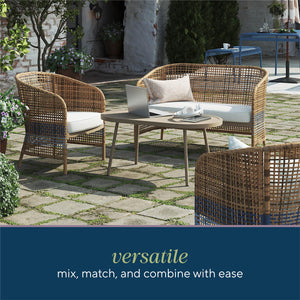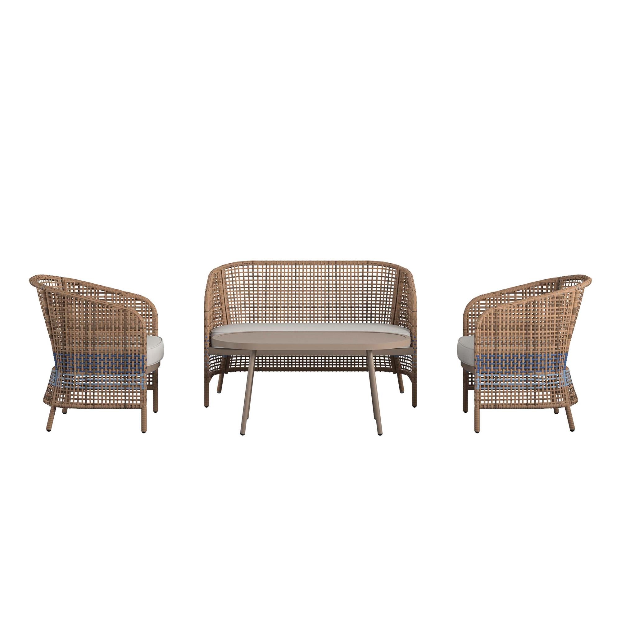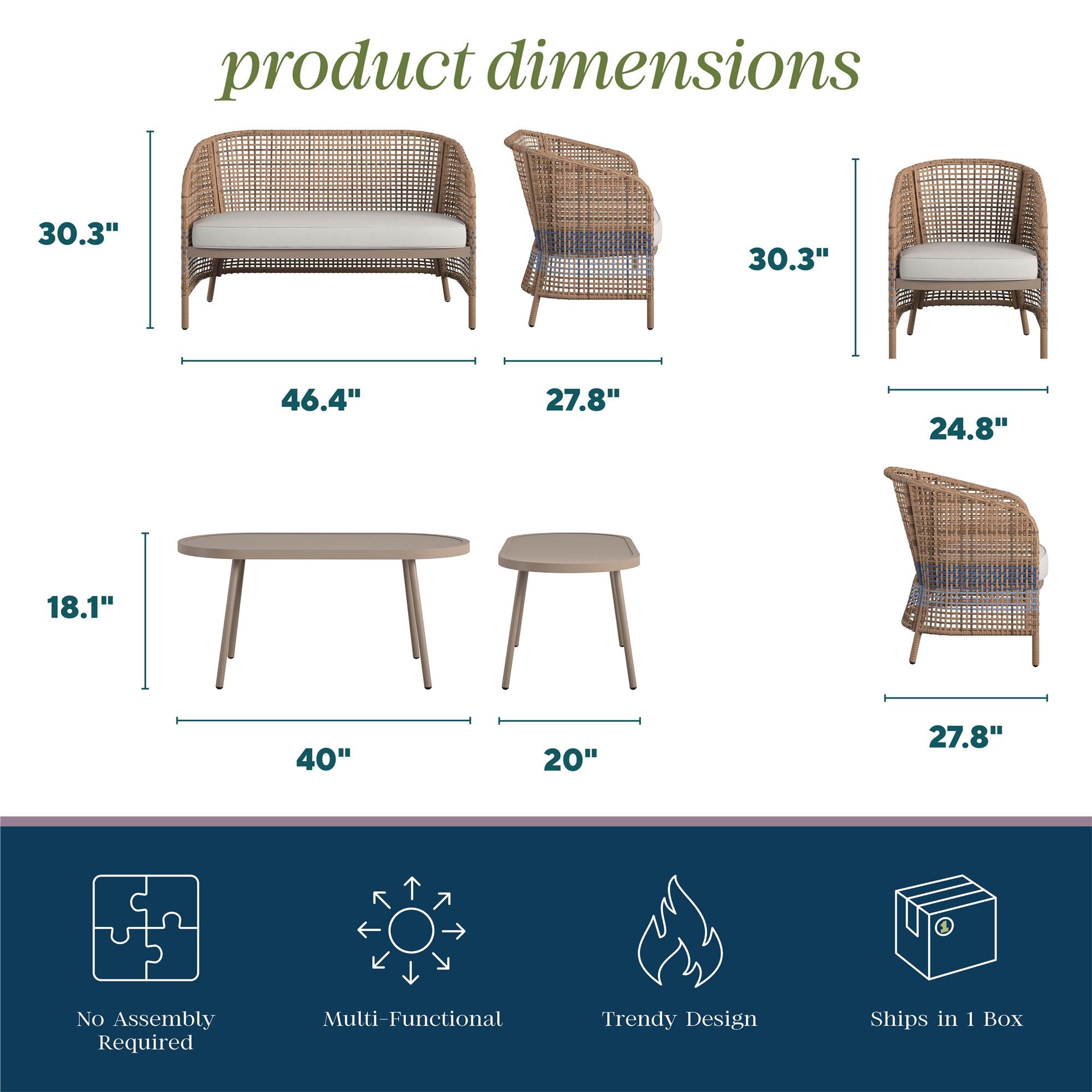 Meet The Novogratz Ava: The social butterfly of outdoor furniture! Ava is the epitome of chic outdoor living, a 4-piece conversation set. With her French blue wicker accents, she brings a touch of European sophistication to any patio or garden. Her comfortable cushions invite you to sit back and relax, making her the perfect host for any gathering. Ava's metal wood grain coffee table is not just a piece of furniture; it's a centerpiece for conversations. Ava ensures that every moment is cozy and inviting. Just like a true friend, Ava is built to last. Her sturdy construction means she can withstand the elements, while still looking fabulous. She's always ready for spontaneous get-togethers, rain or shine. Ava fits seamlessly into any outdoor setting. Whether you have a modern balcony or a rustic backyard, she adapts effortlessly, adding a touch of charm and comfort wherever she goes.