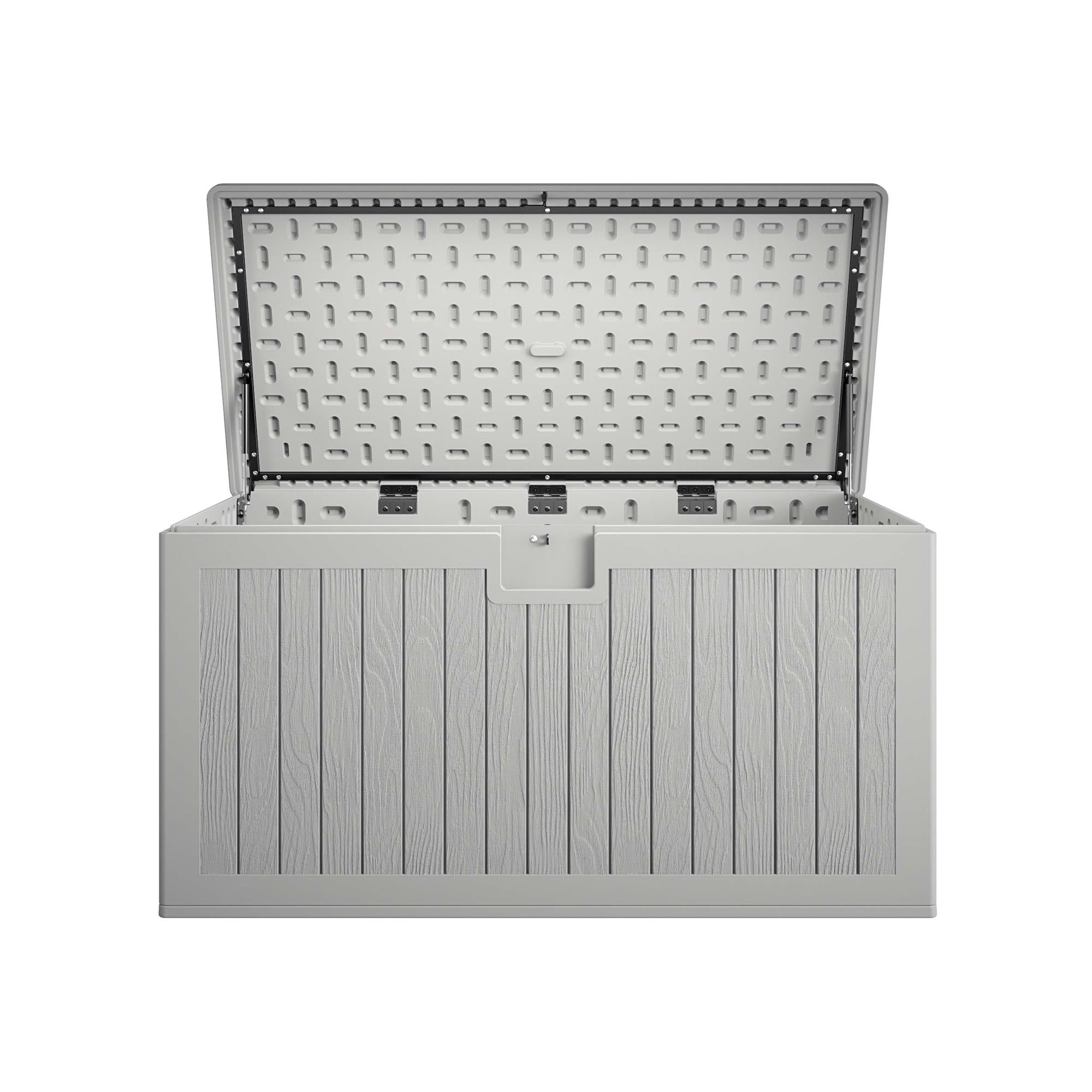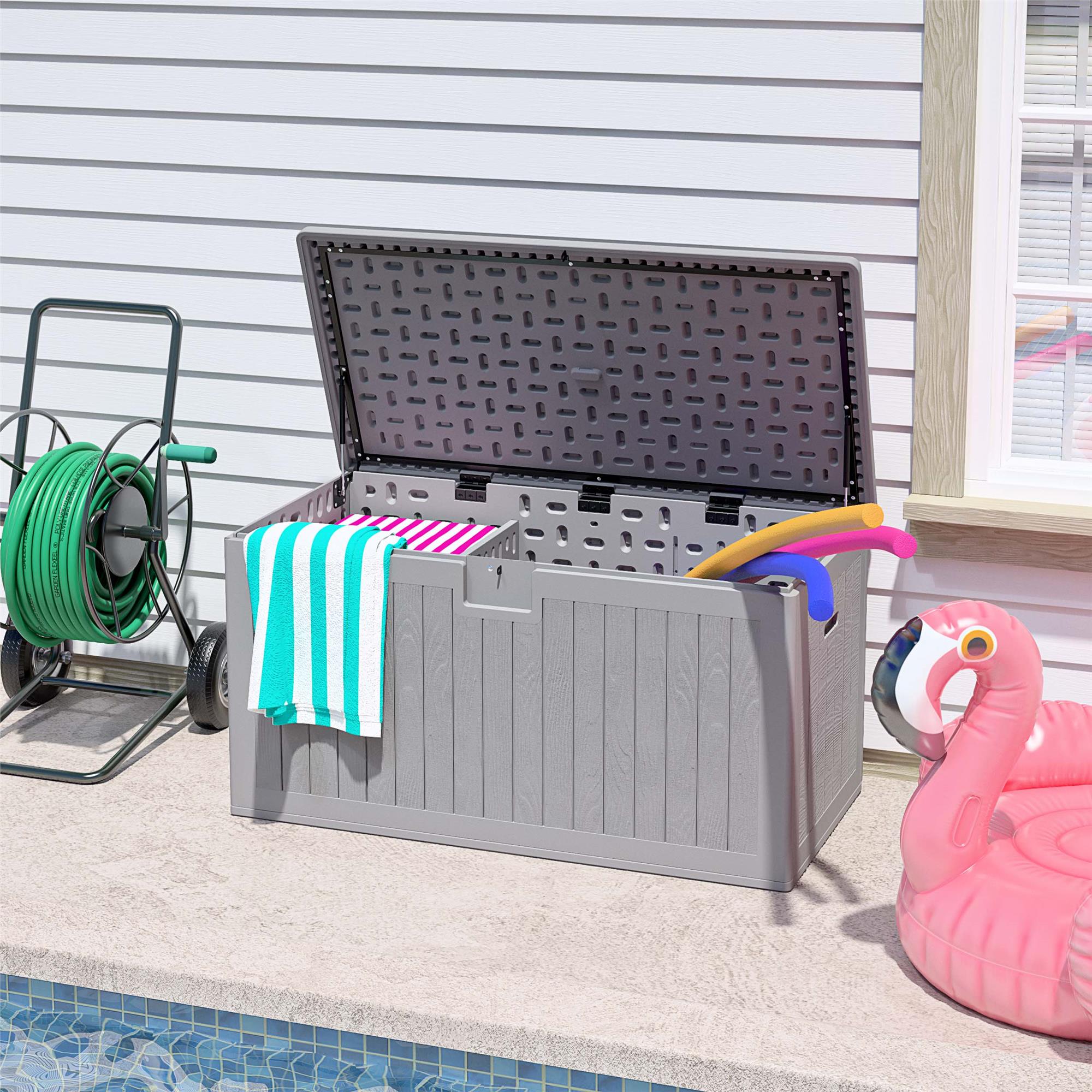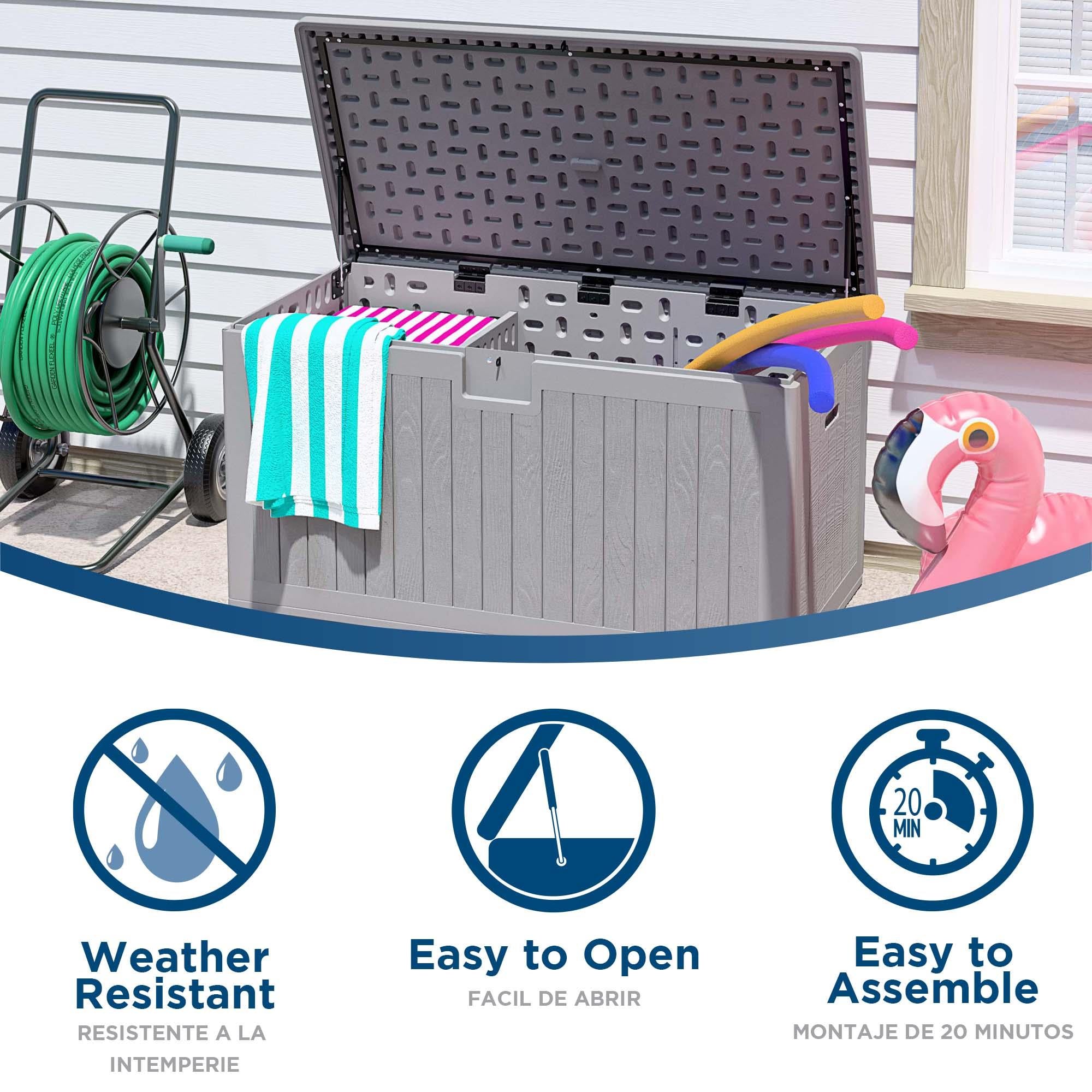Rest easy knowing that your valuable outdoor furniture and accessories are carefully preserved in this COSCO Large 150 Gallon Outdoor Storage Box. Trust this all-weather storage solution to safeguard your comfy cushions from the outdoor elements while also providing innovative organization for everyday use. With its large interior and included storage divider, it can easily store large cushions, garden tools, sports equipment, pool supplies, and much more! Built using durable and weather resistant resin, this storage box comes in a classic gray wood-grain finish to match any outdoor aesthetic. Features a gas hinge design that will hold the lid of the storage box open and allow for easy opening and closing of the lid. Manufactured with a lock-design to keep your valuables safe (lock sold separately). Easy to assemble with simple instructions and all necessary tools provided . Once assembled, this storage box is ready to serve all of your storage needs.