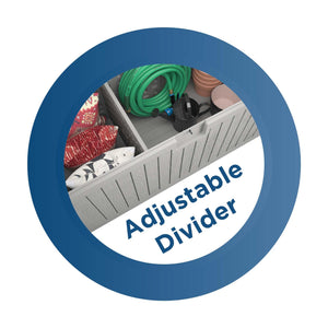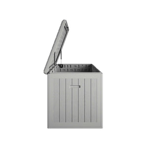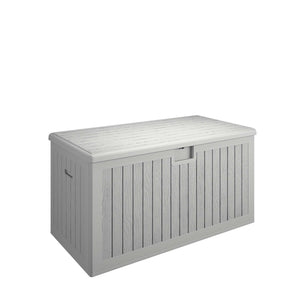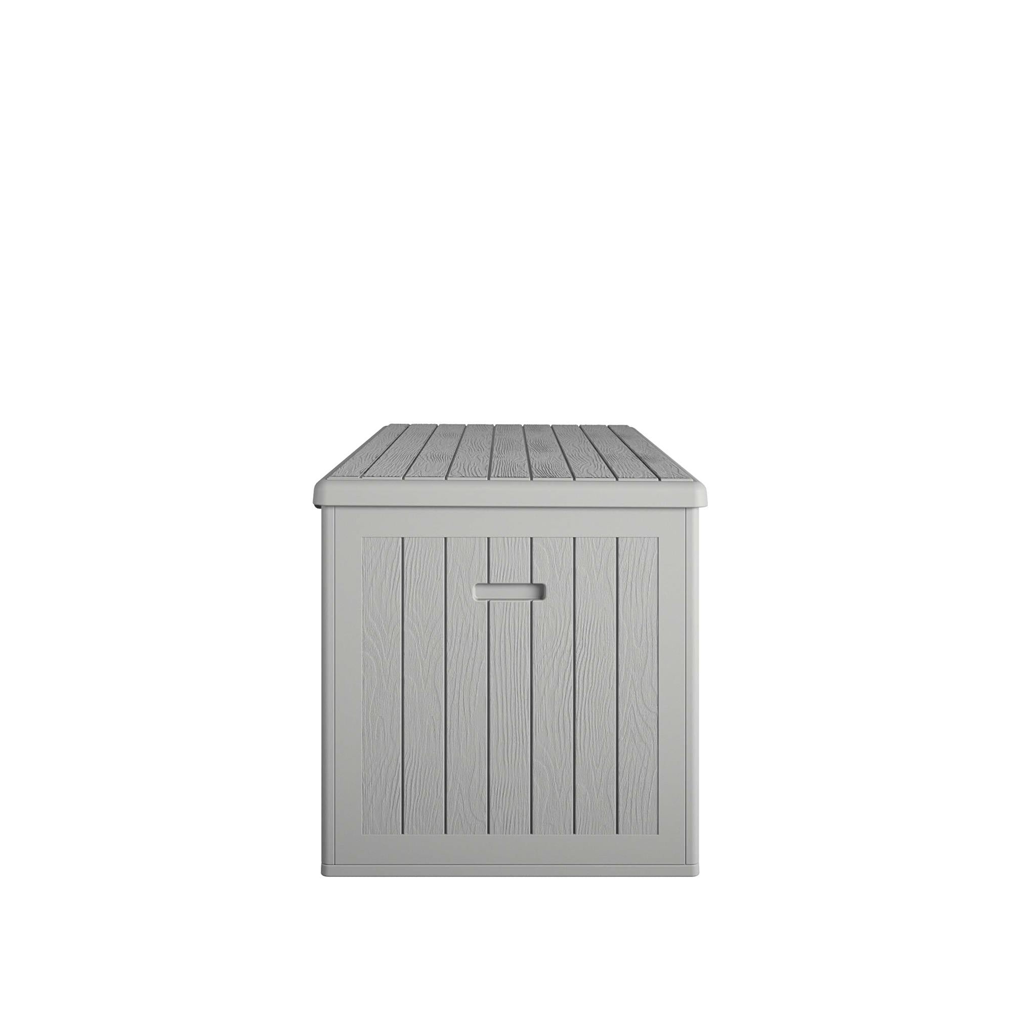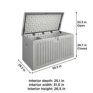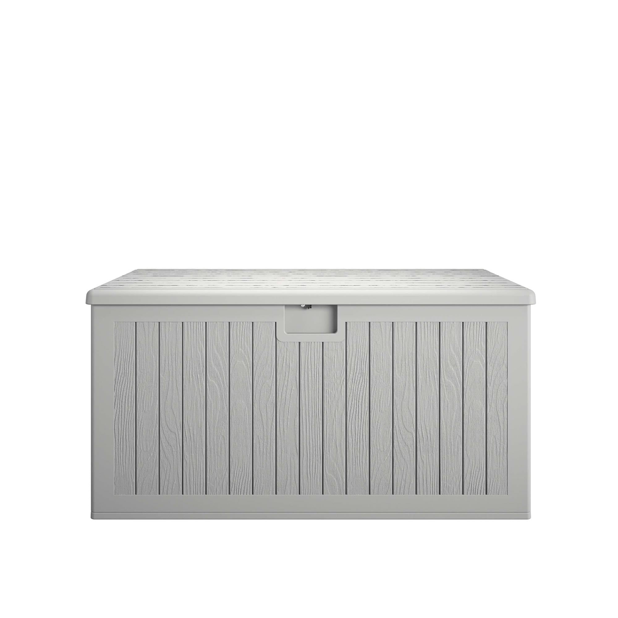Rest easy knowing that your valuable outdoor furniture and accessories are carefully preserved in this COSCO Large 150 Gallon Outdoor Storage Box. Trust this all-weather storage solution to safeguard your comfy cushions from the outdoor elements while also providing innovative organization for everyday use. With its large interior and included storage divider, it can easily store large cushions, garden tools, sports equipment, pool supplies, and much more! Built using durable and weather resistant resin, this storage box comes in a classic gray wood-grain finish to match any outdoor aesthetic. Features a gas hinge design that will hold the lid of the storage box open and allow for easy opening and closing of the lid. Manufactured with a lock-design to keep your valuables safe (lock sold separately). Easy to assemble with simple instructions and all necessary tools provided . Once assembled, this storage box is ready to serve all of your storage needs.